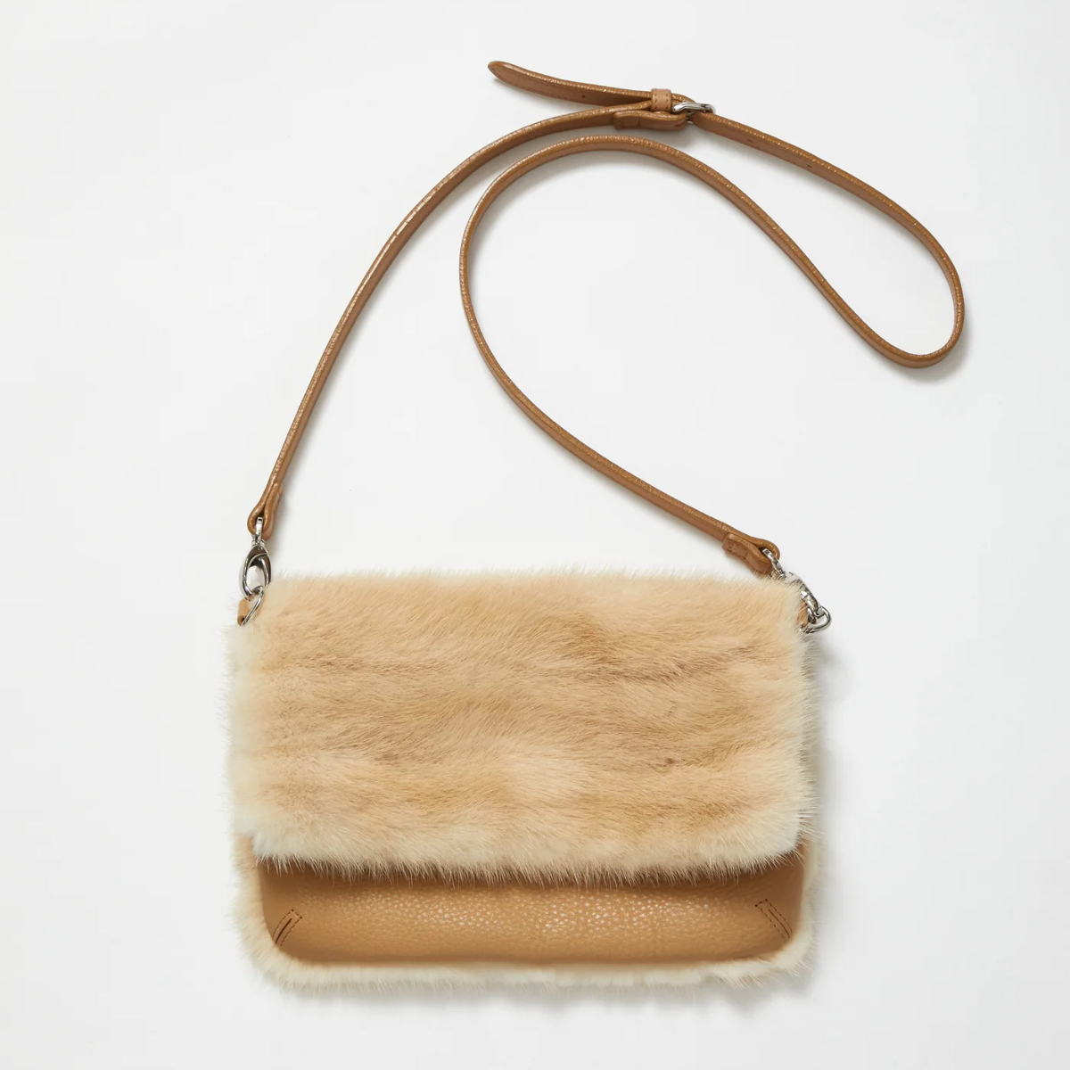 複数の毛皮素材を組み合わせる加工です。写真のように全体を模様のようにミックスしたり、マフラーの先端やバッグの縁に異素材を使うことでデザインにアクセントが加わります。